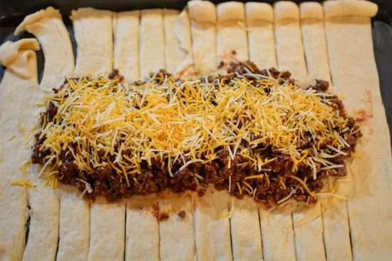 Spread the ground beef mixture along the center strip, sprinkle with cheese.