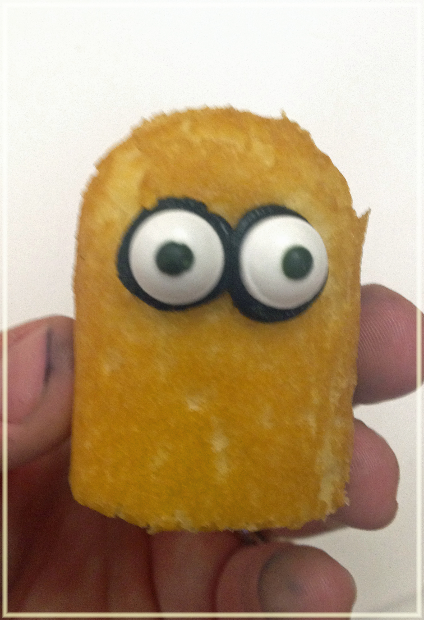- Cut Twinkies in half. Using black frosting, make two black dots for the eyes, press on the Wilton Candy Eyeballs or Smarties. If using Smarties dot with black frosting for eyes. Make two straight lines for the goggle straps.