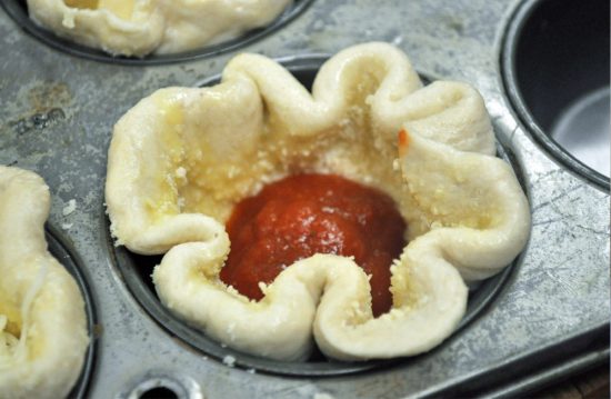 Press 1 biscuit at at time into the un-greased muffin tin, making a bowl like shape. Add 2 tablespoons of pizza sauce.