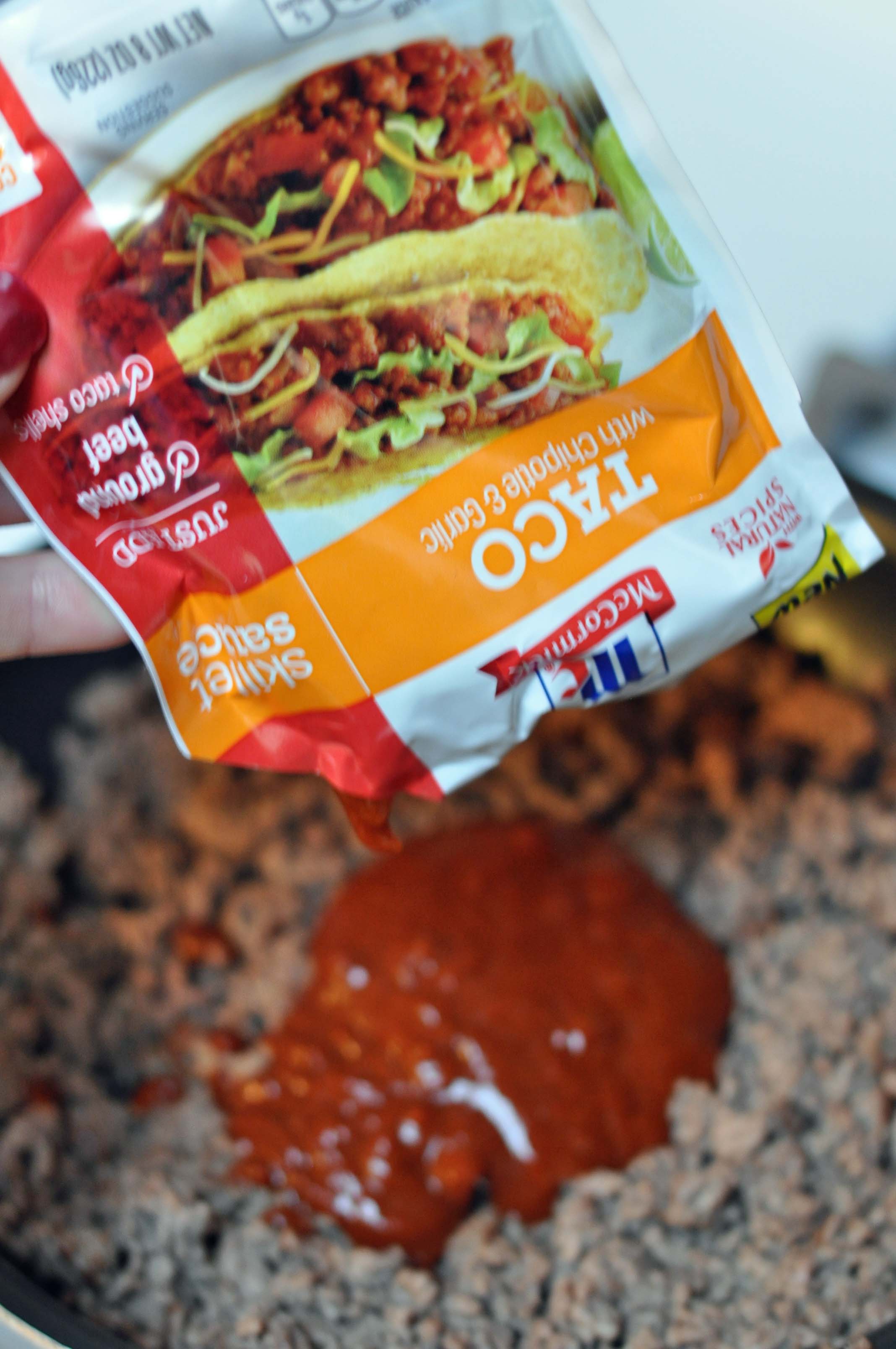 This past I knew we needed a quick meal before kickball, so while we were doing our weekly grocery trip at Walmart we picked up two of the McCormick® Skillet Sauces, Taco with Chipotle & Garlic as well as the Sicilian Chicken for a 2nd quick homemade dinner when we needed it. While the kids were doing their homework, I was able to prep Tacos for the night. There was no measuring involved and I had limited dishes to clean up as I simply had to cut open the top of the sauce pouch and pour it on top of the ground beef. Within minutes the Chipotle & Garlic Tacos were ready to be served.